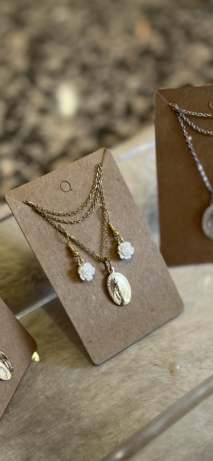 Jolie parure avec la Médaille Miraculeuse et ses Boucles de Roses...